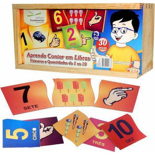 Aprenda a contar em Libras Números e Quantidades do 1 ao 10 Estimular o aprendizado da linguagem em libras através de associação entre a figura que representa a quantidade, o número e o sinal correspondente em Libras. O jogo ajuda a desenvolver a atenção, memória, concentração, percepção visual, discriminação de figuras de forma lúdica e agradável à criança. Conteúdo: Jogo de sinais em Libras, confeccionado em M.D.F. Composto por 30 peças medindo 10 x 10 x 0,3 cm em média. Faixa etária: a partir de 4 anos.