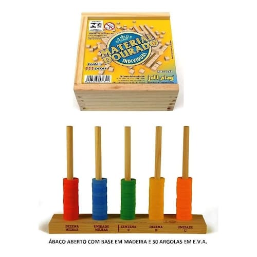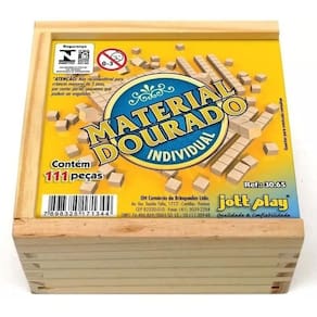 Material dourado 111 peças em madeira Uso: o material dourado foi idealizado pela médica e educadora italiana maria montessori com o objetivo de auxiliar o ensino e a aprendizagem do sistema de numeração décima-posicional, as operações fundamentais, frações-decimais, medidas, etc. Manuseando o material a criança tem a possibilidade de fazer uma imagem concreta das relações numéricas que são abstratas. Isto proporciona o desenvolvimento do raciocínio e o aprendizado muito mais agradável. Desenvolve: raciocínio, numeração decimal-posicional, operações fundamentais, frações decimais, medidas, inequações, etc. Idade: 1ª até a 8ª série / 07 anos. Composição: caixa de madeira medindo 13x13x6cm. Contém 1 placa centenas , 10 prismas dezenas e 100 cubos unidades .