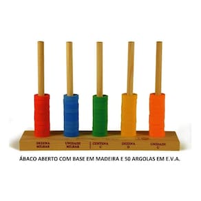 Ábaco aberto Uso: permite a visualização do valor posicional, o que facilita a compreensão do sistema de numeração decimal. Utilizado como intermediário entre a construção da quantidade numérica e sua simbolização. Permite a realização das operações de adição e subtração e números naturais. Desenvolve: construção de quantidades numéricas, valor posicional, sistema de numeração, operações de adição e subtração. Idade: a partir da 1ª série / 7 anos. Composição: aparelho de madeira medindo 21x15x6cm, com 5 hastes e 50 argolas em e.V.A multicoloridas.