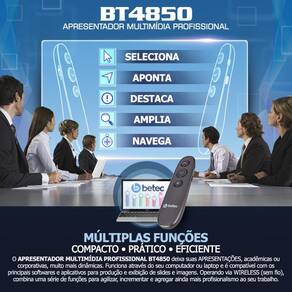Esse é o mais novo e tecnológico Apresentador Multimídia Wireless, agora você terá uma experiência de apresentação muito superior, como nunca antes! Possui 3 opções modos de ponteiros: realce, com ele você poderá realçar determinado objeto na tela, lupa, no qual ampliará e laser digital, semelhante ao tradicional, porém muito mais seguro pois ele é eletrônico, onde poderá escolher a cor e em todos eles poderá configurar o seu tamanho. Você conta também com várias outras funções como clique, tela cheia, página acima, página abaixo, alarme anti-perda, alternar janelas, alarme com display e vibração, aviso de bateria fraca entre outros. Possui bateria interna e acompanha um software para configuração personalizadas dos modos dos ponteiros, velocidade, alarme e outras configurações.