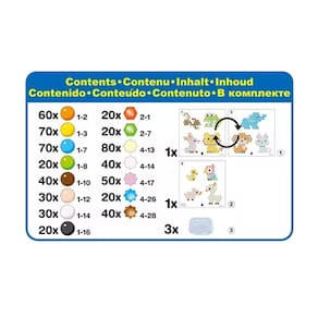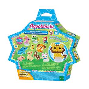 O conjunto de refil de tema Animal Buddies vem com 600 beads em 15 cores, folhas de modelos e instruções. Mostre suas criações animais favoritas com os suportes de beads incluídos! Este conjunto requer o Flip Tray Set, e o Sprayer, cada um vendido separadamente e incluído nos conjuntos completos Aquabeads. Seguindo a folha de modelo, coloque os beads sobre a bandeja para criar seu design. Usando o spray, borrife água sobre os beads para fazê-las colar magicamente juntas! Brinque junto com outros conjuntos completos, com refil de tema e refil de Aquabeads.