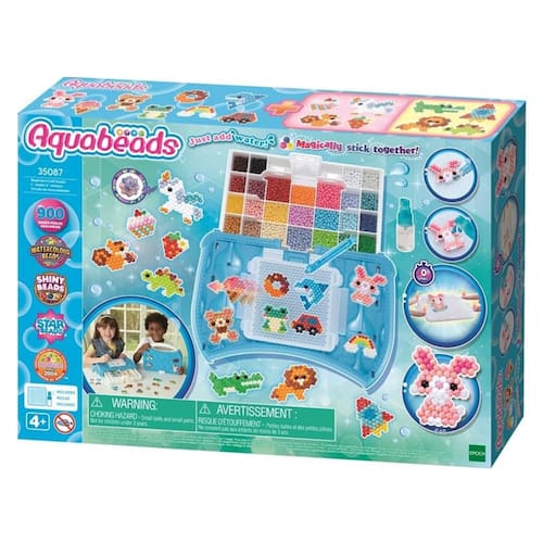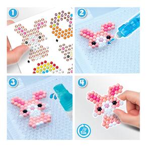 O Beginners Craft Studio para Iniciantes inclui 900 miçangas em 25 cores, Estojo de transporte com Paleta de miçangas, Bandeja pop-up, caneta Aquabeads, pulverizador, tela para criações, pinos de design, 2 Coleções de modelos, folha de modelo e instruções. Seguindo a folha de modelo, coloque as miçangas na bandeja para criar coelho, golfinho, arco-íris, sorvete e muito mais. Usando o pulverizador, borrife água nas miçangas para fazê-las grudar magicamente!