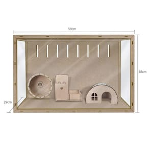 Ofereça ao seu hamster um lar seguro e moderno com este aquário de MDF e PS Poliestireno Com design funcional e elegante, é o espaço perfeito para seu pequeno amigo explorar e se divertir. Descrição detalhada: Este aquário para hamster combina a robustez do MDF com a transparência do PS Poliestireno , criando um ambiente seguro e para o seu pequeno animal de estimação. A estrutura em MDF, cortada a laser, proporciona durabilidade e estabilidade, enquanto a frente em PS Poliestireno transparente permite uma visão clara do interior, facilitando a interação sem perturbar o ambiente do seu pet. As aberturas de ventilação nas laterais garantem a circulação de ar fresco, essencial para a saúde e o bem-estar do seu hamster. A construção cuidadosa com cantos lisos evita ferimentos, garantindo um espaço seguro para o seu animal de estimação. Equipado com uma roda de exercícios, um esconderijo em forma de cabana e um brinquedo de madeira, este aquário é projetado para estimular o comportamento natural do seu hamster, mantendo-o ativo e mentalmente engajado. O design minimalista e a cor clara do MDF conferem uma estética limpa e moderna, que se integra facilmente a qualquer ambiente doméstico. Ficha técnica: Material: Estrutura em MDF com corte a laser, frente em PS Poliestireno Dimensões: 60 cm comprimento x 40 cm largura x 30 cm altura Peso: 2,5 kg Ventilação: Aberturas nas laterais Acessórios: Roda de exercícios, esconderijo tipo cabana, brinquedo de madeira Inclui um saco de serragem de 500g Marca: Não Informado