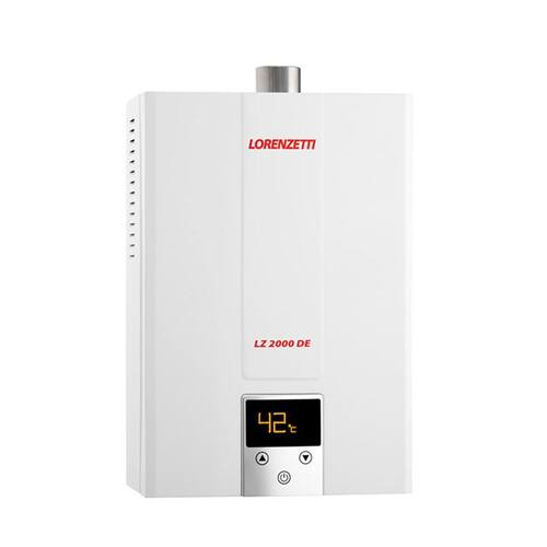 o aquecedor a gás lz 2000de-b glp é ideal para uso com até duas duchas mais um misturador. Possui display touch, vazão 20,0 l/min. Glp, exaustão forçada, modulação automática da chama, programação de temperatura e chaminé 80mm