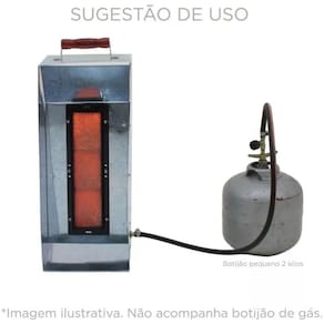 AQUECEDOR COMPLETO INDICADO PARA USO EM AVIÁRIOS, SECAGEM DE SEMENTES E GRÃOS E ESTUFA DE PLANTAS. Utilizado para cocção, aquecimento e secagem. - Sua capacidade é de +/- 300 a 500 pintinhos; Funciona com botijão de gás Queimador Infravermelho GLP -Potencia nominal 1200 kcal/h - 4.700 BTU/h -Consumo médio GLP 110 g/h
