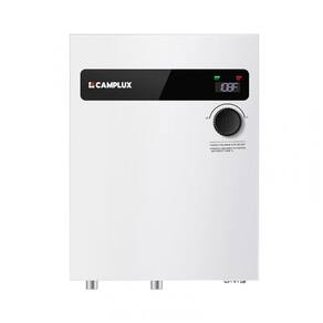 O elemento aquecedor é separado do tubo de água, reduzindo o acúmulo de calcário, corrosão e incrustações minerais. O gabinete compacto em acabamento branco é fixado na parede, permitindo instalação em espaços reduzidos. A instalação é do tipo fixo na parede (hardwire), com conexão de água de 3/4" NPT. O produto é certificado ETL e possui proteção contra superaquecimento, anti-aquecimento a seco e desligamento automático quando não há fluxo de água detectado.