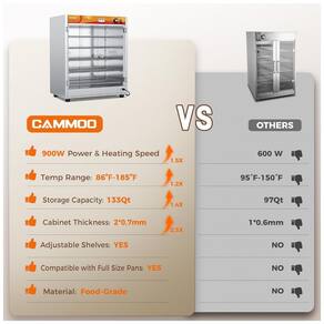 O aquecedor de alimentos comercial CAMMOO de 126 litros com 5 níveis oferece aquecimento rápido e eficiência energética graças ao sistema de 900W equipado com elemento aquecedor de aço inoxidável 304 azulado. Este modelo aquece 25% mais rápido que versões tradicionais, ideal para cozinhas de alto volume, reduzindo tempos de pré-aquecimento e custos operacionais com construção durável.