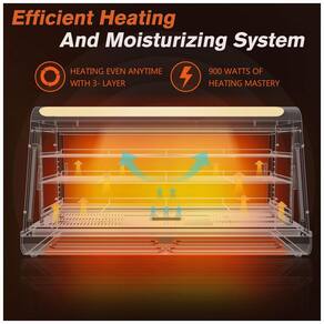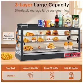 O Aquecedor de Alimentos Countertop Whalefall é um gabinete térmico comercial de 112 cm com estrutura compacta em vidro temperado e design multi-nível para exibição e armazenamento otimizado. Equipado com 4 luzes LED (duas laterais e duas superiores) para iluminação uniforme do interior, além de prateleiras ajustáveis com ganchos e bandejas configuráveis para itens de diversos tamanhos e formatos. O suporte superior acomoda recipientes pequenos como bebidas ou leite, maximizando o espaço em ambientes com área limitada.