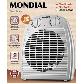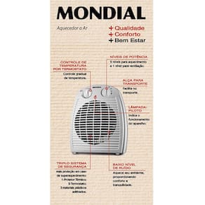 O aquecedor de ar é a pedida certa para aquecer os dias frios de inverno e, além de aquecedor, é também circulador de ar, com 2 níveis para aquecimento e 1 para ventilação... Características técnicas: - fabricante: mondial - modelo: a-08 - voltagem : 127volts potência: 1500watts consumo: 1,5kw/h - voltagem: 220volts potência: 2000watts consumo: 2,0kw/h - linha: aquecedor - material: polipropileno - portátil: sim - silencioso: sim - controle de temperatura: sim. Sendo 2 níveis de potência para aquecimento e 1 para ventilação. Dimensões do produto: - altura aproximada: 26cm - largura aproximada: 13cm - comprimento aproximado: 22cm - peso aproximado: 1,08kg.