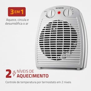 O aquecedor A-08 é 3 em 1: ele aquece, circula e desumidifica o ar. O aparelho tem 2 níveis de aquecimento, é leve e portátil, e você pode transportá-lo entre os cômodos com facilidade. Além de ser mais silencioso e proporcionar um ambiente tranquilo e confortável. Saiba mais sobre o aquecedor da Mondial: