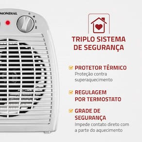 TRIPLO SISTEMA DE SEGURANÇA: Mais proteção contra superaquecimento! Possui protetor térmico, regulagem por termostato e grade protetora, que evita o contato direto com o sistema de aquecimento do produto.
