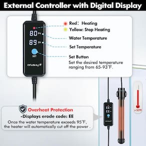 Orlushy Aquecedor submersível de aquário de 200 W, aquecedor de aquário ajustável com controle externo de exibição digital, proteção contra superaquecimento e termômetro para tanque de água doce e salgada de 50 a 100 litros - Orlushy Aquecedor de aquário de 200 W: o aquecedor Orlushy de 200 W pode funcionar perfeitamente em tanques de 20 a 40 galões, adequado para aquários, aquários, tanques betta e tanques de tartaruga. O comprimento deste aquecedor é de 19 cm, que é mais compacto em tamanho do que o aquecedor autêntico, ocupando menos espaço e pode ser facilmente escondido no aquário. - Vidro de quartzo mais seguro e durável: este aquecedor de aquário é feito de vidro de quartzo cinza, que tem maior dureza do que o vidro de quartzo comum, mais resistente a altas temperaturas e à prova de explosão. Este material torna o aquecedor mais seguro e durável para ser utilizado em água doce e salgada, maior vida útil é fornecida. - Aquecimento rápido de água e sensor de água preciso: com fio de níquel-cromo premium enrolado uniformemente, o calor pode se dissipar rapidamente para uma área mais ampla na água, aquecimento de água mais eficiente. O sistema exclusivo de detecção de temperatura da água pode corrigir com precisão a temperatura da água em tempo real no valor definido, protegendo suas vidas aquáticas das flutuações da temperatura da água. Quando a temperatura da água exceder 35 °C, o aquecedor cortará automaticamente a energia e o código de erro "EE" será mostrado, eliminando o risco de "ferver peixe". - Controlador externo com display digital LED: o controle externo reduz o risco de entrada de água e queima o aquecedor, melhorando muito a segurança. O controle remoto permite que você ajuste o aquecedor sem ser feito na água e molhar à mão. A temperatura é ajustável variando de 18.3 °C a 33.9 °C, e o valor definido muda -17.2 °C por prensa. Além disso, você também pode observar a temperatura da água em tempo real no visor digital a qualquer momento. - Termômetro e garantia de 180 dias: Este aquecedor de aquário vem com um termômetro de tira livre para melhor calibrador de temperatura, bem como garantia de 180 dias de que a substituição do aquecedor é fornecida se ocorrer algum problema. Se você tiver algum problema com o aquecedor, sinta-se à vontade para entrar em contato conosco. Fornecemos um serviço pós-venda oportuno.