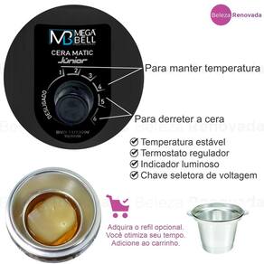 A CERA MATIC JÚNIOR pertence à Linha CERA MATIC MEGA BELL, uma linha de aquecedores profissionais de cera em barra para depilação, com design moderno e diversas opções de cores. Derrete e armazena a cera na temperatura ideal. Nela, podem ser utilizadas ceras em tabletes ou granuladas, deixando o trabalho muito mais rápido e eficiente. Aquecedor profissional ou doméstico para cera de depilação. Equipado com termostato para regulagem de temperatura, indicador luminoso de funcionamento e chave seletora de voltagem. Seu corpo de ABS é resistente à altas temperaturas, e sua resistência blindada, a torna totalmente segura.
