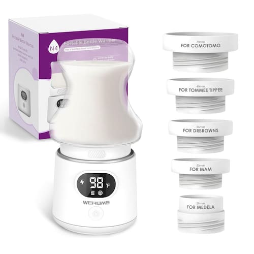 Aquecedor de mamadeiras portátil WERBME, aquecedor de mamadeiras de aquecimento rápido para viagens, design à prova de vazamentos de material de segurança, aquecedor de mamadeiras sem fio para leite materno ou fórmula, com 5 adaptadores para a maioria das mamadeiras