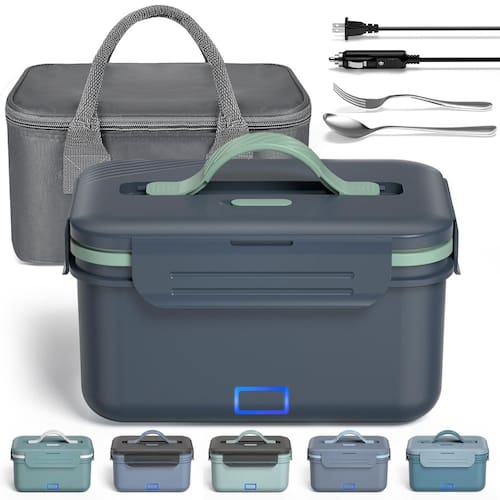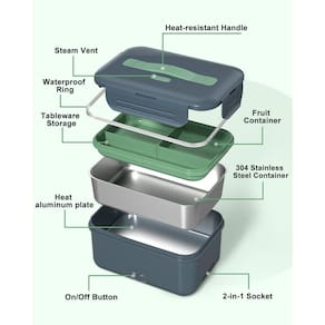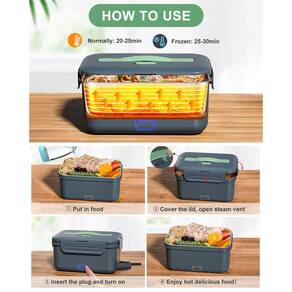 Com uma alça retrátil de borracha, é antiqueimadura e antiderrapante e fácil de transportar. Há um orifício de vapor na capa, com um design de arco circular e um recesso em um lado, que é fácil de abrir à mão. - Design de camada dupla – 2 recipientes empilháveis, o recipiente inferior de aço inoxidável pode conter 1,8 l de comida e a camada superior do recipiente de material PP contém três pequenos compartimentos (1 armazenamento de talheres e 2 compartimentos separados de armazenamento de frutas). O portátil lonchera eléctrica é perfeito para embalar uma variedade de alimentos em porções saudáveis, ajudando você a alcançar uma dieta equilibrada enquanto mantém o sabor autêntico da comida! - Propriedades mais fortes à prova de vazamento – a capa de lancheira elétrica tem travas em todos os quatro lados e sua área de cobertura é projetada para ser maior, tornando-a mais forte e não quebra facilmente. E o anel de vedação de borracha embutido pode garantir que a comida não vaze durante o transporte e mantenha a comida fresca! Não precisa se preocupar com derramamentos de alimentos, mesmo em um ambiente de carro instável! - Desfrute de comida quente e saudável! - Feito de material premium de qualidade alimentar, é o melhor recipiente térmico para embalar alimentos saudáveis. O revestimento externo tem forte resistência ao calor, mesmo que a temperatura interna atinja 100 graus, não estará quente! O aço inoxidável 304 para o tanque interno não tem odor e é durável, reutilizável e fácil de limpar! - Aquecedor de alimentos portátil 4 em 1 – está equipado com 2 adaptadores de energia: um adaptador interno doméstico de 110V/220V, um carro de 12V/24V e um adaptador de caminhão. Conecte a energia para aquecer a comida, pode ser usada em casa/escritório/carro/caminhão. Permite que você desfrute de refeições frescas e quentes, esteja trabalhando ao ar livre ou em ambientes fechados! Também é um presente de elefante branco ideal e emocionante para familiares e amigos! - Alta potência de 100 W e aquecimento rápido: as lancheiras elétricas para adultos adotam um sistema de aquecimento PTC, com temperatura constante e função de ciclo de baixo consumo de calor, pode manter os alimentos aquecidos uniformemente e também bloquear a umidade dos alimentos. Leva apenas 20 a 30 minutos para aquecer rapidamente até a temperatura ideal, desfrute de uma refeição caseira fresca! Elimine a fadiga do seu dia!