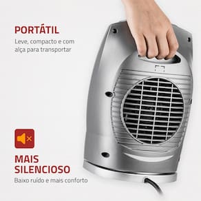 Características: Potência: 1500W Consumo de energia: 1,5Kw/h Comprimento do cabo: 1m 2 Níveis de aquecimento Resistencia de cerâmica Aquecimento com baixo ruido Desligamento automático Grade de segurança Com alça para transporte Luz Indicadora Inmetro: BRA23/00339