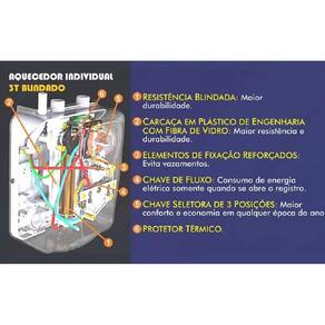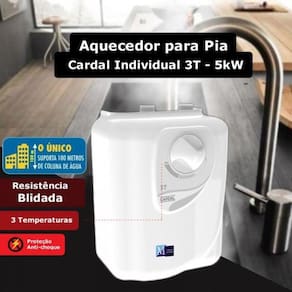 Possui resistência Blindada e por isso tem maior durabilidade 3 Opções de Temperatura Sem complicações, o Aquecedor é instalado diretamente no ponto de uso, sem a necessidade de extensas tubulações de água quente, comum nos sistemas de aquecimento central O único que suporta até 100 metros de coluna d'água Carcaça em plástico de engenharia com fibra de vidro: maior resistência e durabilidade Elemento de fixação reforçados: evita vazamentos Com a chave de fluxo é possível consumir energia somente quando o registro for aberto Compatível com aquecimento solar Compatível dispositivo D.R. Resistências independentes Aprovado pelo INMETRO Baixo consumo de energia Informações técnicas: Marca: Cardal Cor: Branco Modelo: Aquecedor Individual 3T Tipo de aquecedor: Individual Temperaturas: 3 Energia de Alimentação: 220 Volts Potência: 5000 Watts Fiação Mínima: 4mm² Pressão de funcionamento: Mínima: 20 kPa (2 m.C.A.) Máxima: 100 kPa (100 m.C.A.) Disjuntor: 25 A Altura 22 cm Largura 10 cm Comprimento 15 cm Material em plastico