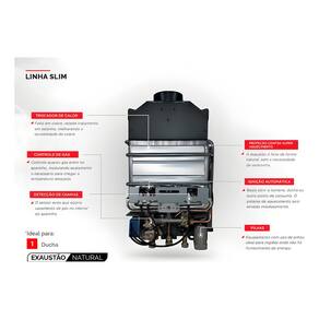 - Tipo de gás: GLP. - Vazão de água com acréscimo de 20º (L/min): 7. - Classificação INMETRO: A. - Rendimento: 85. - Consumo máximo de gás: 0,81kg/h. - Pressão de gás - dinâmico (mm.c.a.): 280. - Tempo de Ignição: Automática. - Vazão mín. para acendimento (l/min) : 3. - Alimentação de energia: 3VDC (2 pilhas 1,5V). - Exaustão: Natural.