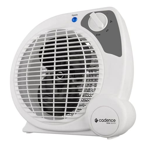 O Aquecedor Termoventilador New Auros da Cadence, modelo AQC422-220, e um equipamento portatil, leve e eficiente para aquecer ambientes de ate 25 m2. Conta com tres niveis de funcionamento: ventilacao, aquecimento medio e aquecimento maximo, atingindo ate 1800 watts de potencia. Possui resistencia fechada, termostato regulavel e sistema de seguranca com desligamento automatico em caso de queda ou superaquecimento. A grade frontal evita contato direto com a resistencia e a alca superior facilita o transporte.