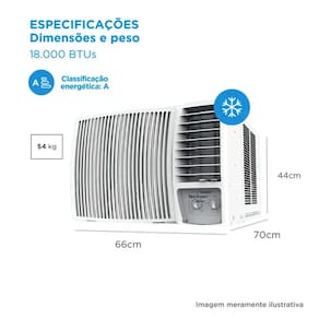 Características: Marca: Springer Midea Modelo: ZCK185BB Tipo: De janela Capacidade: 18.000 BTUs Ciclo: Frio Compressor: Rotativo Velocidades: Baixa e alta + modo ventilação. Gás refrigerante: R-410A Eficiência energética: A Potência: 1757W Consumo: 1,454 kWh/ano Frequência: 60 Hz