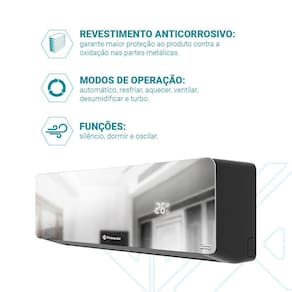 Ciclo quente e frio Capacidade de 18000BTUs Compressor hermético rotativo Inverter Tecnologia Eco Inverter – até 70% de economia de energia Gás ecológico R32 Classificação energética A Serpentina em cobre e placa eletrônica anticorrosiva Filtro anti-bactéria lavável e removível Modos: Esfriar, Aquecer, Desumidificar, Ventilar e Automático Funções: Dormir, Timer e Oscilar Controle de ventilação com 4 velocidades (Alto, Médio, Baixo e Automático) Temperatura ajustável entre 16°C e 32°C Vazão máxima de ar: 850m³/h Design espelhado