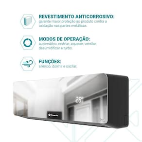 Seu funcionamento é mais sustentável graças ao gás ecológico R32, que reduz o impacto ambiental sem comprometer o desempenho. A serpentina em cobre com revestimento anticorrosivo do Ar-Condicionado Espelhado Prime Air garante maior durabilidade, mesmo em regiões úmidas, preservando a eficiência por muito mais tempo.