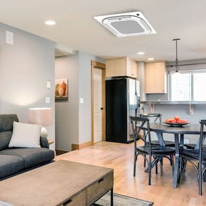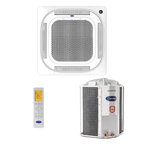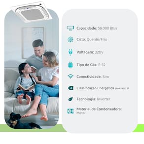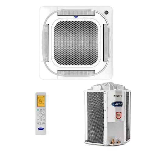 Ar Condicionado Split Cassete 4 Vias - Inverter R-32 - Connect - Carrier - 58.000 BTUs - Quente/Frio - 220V Monofásico O split Cassete Inverter Carrier é o equipamento ideal para quem precisa climatizar grandes ambientes residenciais, salas amplas e conjuntos comerciais com distribuição uniforme no ambiente. O sistema conta com a tecnologia de compressores de velocidade variável, que proporcionam grande economia de energia, e fluido refrigerante ecológico R-32. Diferenciais do ar-condicionado Split Cassete Inverter Carrier Bomba de Dreno incorporada Evita acúmulo de água na unidade interna e gotejamento. Operação ultra-silenciosa Ventilador interno com design de alta tecnologia que proporciona baixo nível de ruído. Painel frontal removível Facilita a manutenção e acesso aos componentes internos sem a necessidade de retirar o produto do teto ou forro. Função Eco Tecnologia com operação inteligente da unidade interna proporcionando maior economia de energia. Sistema de renovação de ar opcional Permite a troca constante de ar do ambiente, ar mais puro e saudável para todos os usuários. Display digital na unidade interna Facilita a leitura das informações e funções escolhidas, além da opção de desligar o display através do controle remoto, tornando o ambiente mais agradável a noite. Display digital no controle remoto Exibe o modo de operação e a temperatura desejada. Função Swing Distribuição uniforme de ar em todo o ambiente por meio de defletores laterais. 4 modos de funcionamento Resfria, desumidifica, ventila e aquece (função aquecimento disponível apenas em aparelhos quente e frio). 4 velocidades de ventilação Baixa, média, alta e automático. Timer ON/OFF Programa o horário para ligar e desligar. Conforto por todos os lados O novo Split Cassete Carrier possui um painel com saída de ar em 360° que otimiza a distribuição de ar pelo ambiente, aumenta o desempenho do aparelho e traz muito mais conforto.