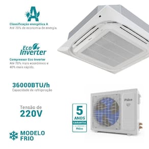 O Ar Condicionado Split Cassete Philco Eco Inverter 36.000 BTUs Frio 220V é ideal para ambientes amplos, unindo conforto e economia. Com tecnologia Inverter e gás R32, oferece alta eficiência energética e menor impacto ambiental. Possui funções Dormir, Oscilar, Timer, Turbo, Silêncio e Display, além de controle remoto com visor de cristal líquido. O Auto Restart recupera as configurações após quedas de energia, e o filtro antibacteriano lavável garante ar mais puro. É a escolha ideal para quem busca climatização eficiente, design discreto e funcionalidades avançadas em um único aparelho.