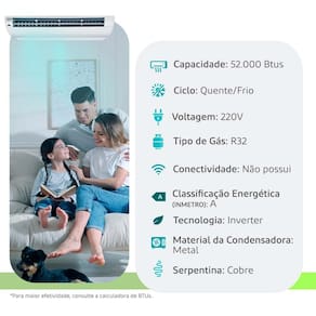 r Condicionado Split Teto Inverter R-32 Fujitsu 52000 Btus Quente/frio 220v Monofásico ABBH54KRTA Estamos comprometidos em desenvolver produtos de qualidade por meio de uma abordagem sustentável. Nossa estratégia de crescimento se fundamenta em três pilares: Coexistência e Harmonia com o Planeta, Contribuição para a Sociedade e Empatia com os Colaboradores. Acreditamos que seguir esses princípios não só nos permite criar um futuro promissor, mas também contribuir para o bem-estar global. Motivos para Escolher um Ar-condicionado Fujitsu 100% Inverter Fomos pioneiros ao introduzir no Brasil a tecnologia Inverter, revolucionando a indústria de climatização. Nossos sistemas contam com motores e ventiladores Inverter, ajustando-se à velocidade necessária para manter o ambiente aquecido ou resfriado, sem oscilações ou picos de energia. Isso resulta em menor consumo de energia e atinge a temperatura desejada com rapidez, superando aparelhos convencionais. Com a tecnologia Inverter da Fujitsu General, você desfruta de maior conforto térmico e economia de energia. Economia Nossos equipamentos incorporam tecnologia de ponta, assegurando alta qualidade e eficiência energética comprovadas pelo Inmetro. A economia de energia é um diferencial marcante de nossos produtos. Utilizando tecnologia avançada, nossos equipamentos consomem menos energia do que os modelos convencionais, resultando em uma significativa redução na conta de luz. Ao escolher a Fujitsu, você contribui para um mundo mais sustentável, reduzindo o consumo de energia elétrica e, consequentemente, as emissões de gases poluentes. Qualidade Duradoura Desde 1960, nossa empresa dedica-se à criação de sistemas de climatização sinônimos de excelência e confiabilidade em todo o mundo. Orgulhamo-nos em afirmar que nossos equipamentos são os mais duráveis e confiáveis do mercado, graças ao rigoroso processo de testes antes da comercialização. Diferentemente de outras empresas, não realizamos testes por amostragem, assegurando que todos os equipamentos Fujitsu são de qualidade superior, oferecendo o melhor desempenho e economia de energia possível. Operação mais silenciosa Nossos equipamentos possuem a função "Super Quiet", proporcionando um ambiente mais agradável e confortável em diferentes espaços, como hospitais, escolas, escritórios, e outros. Maior proteção contra corrosão Contando com a proteção Blue Fin, uma camada especial aplicada em trocadores de calor, nossos equipamentos garantem resistência à corrosão causada por umidade, maresia, poluição, entre outros fatores. Disponível para os modelos teto 30, 36, 45 e 54 BTU. Amigo do meio ambiente Acreditamos na essencialidade da sustentabilidade para um futuro melhor. Nossa estratégia de crescimento concentra-se em ser o mais amigo do meio ambiente possível, oferecendo soluções eficientes e sustentáveis. Utilizamos o refrigerante R32, de baixo impacto ambiental, e nossos equipamentos apresentam eficiência energética excepcional, proporcionando economia de energia. Essas características tornam nossos equipamentos uma escolha consciente e responsável para quem busca soluções de climatização confiáveis e sustentáveis. Design Premiado Apresentando um novo design com superfície leve, elegante e suavemente curvada, nossos equipamentos proporcionam uma sensação de conforto e bem-estar. Conquistamos o prêmio Reedot Winner 2020 com o modelo Teto. Selo Procel Ouro Nossas soluções de climatização são ecologicamente mais amigáveis, com alta performance em eficiência energética. Os modelos Teto e Cassete em R32 receberam o selo Procel na categoria ouro, sendo a primeira marca a conquistar essa certificação pelo modelo Teto de 24 mil BTU.
