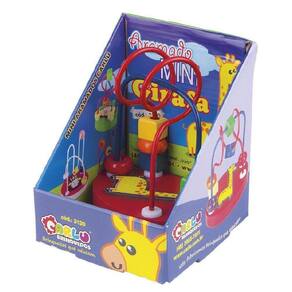 Brinquedo confeccionado em madeira, M.D.F. e arame. Composto por 02 circuitos e 6 peças de formas variadas e coloridas.