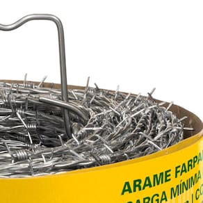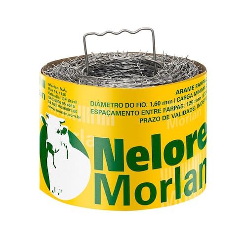 O arame farpado Nelore Morlan é fabricado com aço zincado para proteção contra a corrosão e possui classificação de resistência mínima de 250 kgf.
