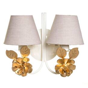 Ter uma iluminação indireta, além da central, deixa o quartinho do bebê mais versátil. Aposte no charme luminotécnico que esta arandela pode propocionar e impressione com este item de decoração encantador. Dados TécnicosArandela para duas lâmpadas em alumínio com pintura eletrostática branca, decorada com duas flores de metal grandes com folhas e cúpulas forradas com tecido. MedidasLargura: 30 cmAltura: 25 cm