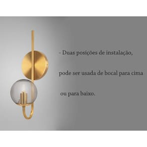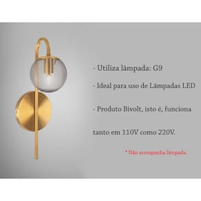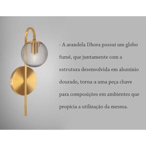 Nós da Acende a Luz procuramos trazer o que há de mais atual e moderno no mundo da Iluminação priorizando sempre a qualidade. Procuramos não apenas atender às suas necessidades, mas superar expectativas. Assim estabelecendo uma relação de confiançaNossa missão é garantir a satisfação total dos nossos clientes. A arandela Dhora possui um globo fumê, que juntamente com a estrutura desenvolvida em alumínio dourado, torna-a uma peça chave para composições em ambientes que propicia a utilização da mesma. Duas posições de instalação, pode ser usada de bocal para cima ou para baixo. Pode pegar chuva e sol pois é fabricada em material resistente e pintura especial. Descrição:- Materiais: Estrutura: Alumínio Globo: Vidro- Cor: Estrutura: Dourado Globo: Fumê- Dimensões: Estrutura: Comprimento: 12,50cm Largura:11cm Altura: 33,50cm Base canopla que fixa na parede : 12,5 cm Globo : 10cm- Utiliza lâmpada: G9- Tensão: 127/220V- Bivolt Não acompanha lâmpada Pode pegar chuva e sol pois é fabricada em material resistente e pintura especial.------------------------------------------------------------- Duas posições de instalação -Ela pode ser usada de bocal para cima ou para baixo.-----------------------------------------------------------Experimente o que há de melhor em iluminação com a ajuda de nossos profissionais. Oferecemos uma ampla variedade de cores, estilos e tamanhos para garantir que você encontre a luminária perfeita.