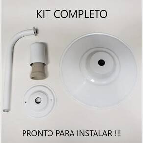 O kit contém: prato em alumínio 10'' BRANCO, braço galvanizado de 5/8 de 30cm, soquete cerâmico e27 e canopla rosqueável galvanizada.