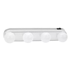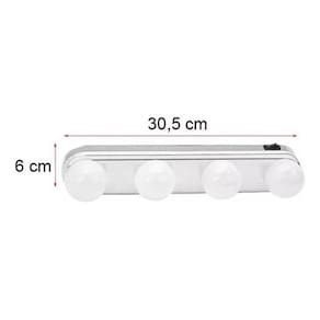 Arandela Camarim Espelho Maquiagem Led 4 Lampada Sem Fio Voltagem: pilha Arandela de Espelho em formato super inovador. Sinta-se uma verdadeira Diva diante do espelho com esta belíssima luminária que vai levar para sua casa o estilo utilizado nos camarins das grandes estrelas São 4 Leds em formato de lâmpadas tradicionais, que garantem ao mesmo tempo ótima luminosidade e muito estilo e o melhor de tudo é que por serem lâmpadas de led, não esquentam e por ser uma luminária alimentada por pilhas, mesmo se faltar luz você garante a maquiagem em grande estilo Características - Material: Polipropileno - Lâmpadas Duram Muito - Possui 4 Led - Potência de 0-5 W Cada Led - Botão Liga/Desliga - Alimentação: 4 Pilhas AA Não inclusas - Portátil Conteúdo da embalagem 1x - Arandela Para Espelho Dimensões do produto - Altura: 6 cm - Comprimento: 30,5 As imagens utilizadas no anúncio são ilustrativas. Produto totalmente sem fios.