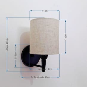 Arandela Cilindrica Md-2009 Base Preto Cúpula Em Tecido 14x15cm Rustico Bege - Bivolt Arandela de parede Cilindrica Md-2009 Base Preta Cúpula em Tecido 14x15cm Rustico BegeAs arandelas Lustres Vivare são elementos versáteis e elegantes que podem transformar qualquer ambiente em um espaço cheio de estilo. Seja para adicionar uma iluminação suave, destacar uma parede ou criar um efeito de luz diferenciado.Dimensão:Cúpula em Tecido: 14x15cm Arandela de parede Montada: Altura 22cm Largura 14cm Profundidade 16cm Formato: Cilíndrico Tamanho: Pequeno Especificação:Material: Cúpula em Tecido Estrutura em Alumínio Base Parede: Diâmetro 11x1,2cm Resistente: Á Maresia Voltagem: 110V/220V Liga e Desliga: Não Tipo de Soquete: E27 Lâmpada Utilizada: Led Bulbo Até 16w ou Fluorescente Espiral Até 25w Cada Capacidade de Lâmpadas: 1 Observação:Acompanha Lâmpada: Não Possui Led Integrado: Não Garantia: 12 Meses Manual de Instalação: Sim Arandela de parede Montada: Sim Controle de Luminosidade: Não Tipo de Embalagem: Caixa Conservação e Manutenção do Produto:A Limpeza deve ser realizada com o produto desligado. Remova o lustre que pode ser lavado com sabão neutro. Nunca utilize produtos químicos e abrasivos Dica:Antes de comprar o seu produto verifique as medidas, o local onde pretende instalar e se necessário o serviço de um profissional qualificado.