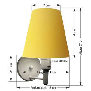 Arandela de parede Cone Md-2013 Branca C/ Inter Liga e Desl Cúpula Tecido AmareloAs arandelas Lustres Vivare são elementos versáteis e elegantes que podem transformar qualquer ambiente em um espaço cheio de estilo. Seja para adicionar uma iluminação suave, destacar uma parede ou criar um efeito de luz diferenciado.Dimensão:Cúpula em Tecido: 14x07x14cm Arandela de parede Montada: Altura 27cm Largura 14cm Profundidade 16cm Formato: Cone Tamanho: Pequeno Especificação:Material: Cúpula em Tecido Estrutura em Alumínio Base Parede: Diâmetro 11x1,2cm Resistente: Á Maresia Voltagem: 110V/220V Liga e Desliga: Interruptor no Soquete Tipo de Soquete: E27 Tipo de Lâmpada: Led Bulbo até 16w ou Fluorescente Espiral até 25w Cada Capacidade de Lâmpadas: 1 Observação:Acompanha Lâmpada: Não Possui Led Integrado: Não Garantia: 12 Meses Manual de Instalação: Sim Arandela de parede Montada: Sim Controle de Luminosidade: Não Tipo de Embalagem: Caixa Conservação e Manutenção do Produto:A Limpeza deve ser realizada com o produto desligado. Remova o lustre que pode ser lavado com sabão neutro. Nunca utilize produtos químicos e abrasivos Antes de comprar o seu produto verifique as medidas, o local onde pretende instalar e se necessário o serviço de um profissional qualificado.