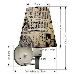 Arandela de parede Cone Md-2013 Branca C/ Inter Liga e Desl Cúpula Tecido JornalAs arandelas Lustres Vivare são elementos versáteis e elegantes que podem transformar qualquer ambiente em um espaço cheio de estilo. Seja para adicionar uma iluminação suave, destacar uma parede ou criar um efeito de luz diferenciado.Dimensão:Cúpula em Tecido: 14x07x14cm Arandela de parede Montada: Altura 27cm Largura 14cm Profundidade 16cm Formato: Cone Tamanho: Pequeno Especificação:Material: Cúpula em Tecido Estrutura em Alumínio Base Parede: Diâmetro 11x1,2cm Resistente: Á Maresia Voltagem: 110V/220V Liga e Desliga: Interruptor no Soquete Tipo de Soquete: E27 Tipo de Lâmpada: Led Bulbo até 16w ou Fluorescente Espiral até 25w Cada Capacidade de Lâmpadas: 1 Observação:Acompanha Lâmpada: Não Possui Led Integrado: Não Garantia: 12 Meses Manual de Instalação: Sim Arandela de parede Montada: Sim Controle de Luminosidade: Não Tipo de Embalagem: Caixa Conservação e Manutenção do Produto:A Limpeza deve ser realizada com o produto desligado. Remova o lustre que pode ser lavado com sabão neutro. Nunca utilize produtos químicos e abrasivos Antes de comprar o seu produto verifique as medidas, o local onde pretende instalar e se necessário o serviço de um profissional qualificado.