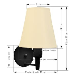 Arandela de parede Cone Md-2013 Preta C/ Inter Liga e Desl Cúpula Tecido Algodão CrúAs arandelas Lustres Vivare são elementos versáteis e elegantes que podem transformar qualquer ambiente em um espaço cheio de estilo. Seja para adicionar uma iluminação suave, destacar uma parede ou criar um efeito de luz diferenciado.Dimensão:Cúpula em Tecido: 14x07x14cm Arandela de parede Montada: Altura 27cm Largura 14cm Profundidade 16cm Formato: Cone Tamanho: Pequeno Especificação:Material: Cúpula em Tecido Estrutura em Alumínio Base Parede: Diâmetro 11x1,2cm Resistente: Á Maresia Voltagem: 110V/220V Liga e Desliga: Interruptor no Soquete Tipo de Soquete: E27 Tipo de Lâmpada: Led Bulbo até 16w ou Fluorescente Espiral até 25w Cada Capacidade de Lâmpadas: 1 Observação:Acompanha Lâmpada: Não Possui Led Integrado: Não Garantia: 12 Meses Manual de Instalação: Sim Arandela de parede Montada: Sim Controle de Luminosidade: Não Tipo de Embalagem: Caixa Conservação e Manutenção do Produto:A Limpeza deve ser realizada com o produto desligado. Remova o lustre que pode ser lavado com sabão neutro. Nunca utilize produtos químicos e abrasivos Antes de comprar o seu produto verifique as medidas, o local onde pretende instalar e se necessário o serviço de um profissional qualificado.