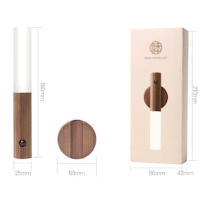 Nome do produto: Luz de sensor inteligente Material do produto: madeira maciça, acrílico, eletrônica Configuração padrão do produto: lâmpada de indução, base, cabo de carregamento Fonte de luz: luz LED Cor da luz: 2700K ~ 300OK luz branca quente Modo de luz: sensor de movimento/liga/desligamento instantâneo Capacidade da bateria: bateria de lítio de 500mAh Potência da luz: 1W Classificação IP do LED: IP20 Atraso de iluminação: 15 segundos Tensão nominal: DC5V 1A Distância de detecção: 4 metros Peso líquido do produto: 100 gramas Tamanho da embalagem: 80 × 43 × 210 mm