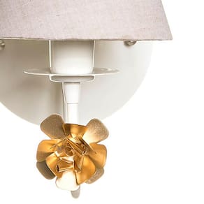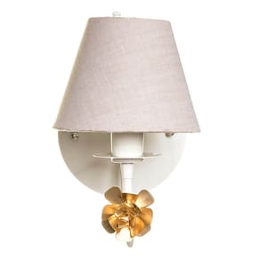 Com seu design delicado, essa arandela é produzida em alumínio com pintura epóxi e possui uma florzinha de metal dourada como detalhe decorativo. A cúpula é forrada com tecido, garantindo um acabamento elegante e sofisticado.