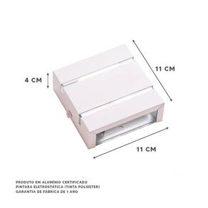 Especificações Técnicas: Marca: Ideallume Modelo: Ar1112 Fixação: Parede/Muro Tipo de uso: Interno e Externo Pintura: Eletrostática - Tinta: microtextura poliéster Cor: Branco Material Da Arandela: Alumínio e vidro. Voltagem Da Arandela: Bivolt 110/220v Soquete: G9 Halopin Medidas L x A x P : 11 x 11 x 4 cm Lâmpada: Utiliza 1 lâmpada Não inclusa