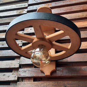 Luminária roda de carroça replica rustico, fabricado em mdf e pintado a mão. Envernizado deixando um acabamento envelhecido perfeito.