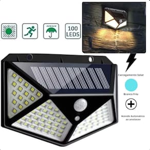 Especificações: Potência: 20w Luminosidade: 600lm Quantidade de leds: 100 Ângulo de iluminação: 270º Ângulo do sensor de presença: 120º Fonte de alimentação: solar Distância do sensor: 3-5m Classe de proteção: ip65 Material: abs Autonomia da bateria: 1200mah Cor do led: branco frio Tempo de uso: até 10h Tempo de carregamento: 2 - 7h no sol Resistente à água
