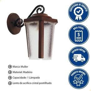 Arandela Muller Lanterna Envelhecida 750e - Arandela Muller Lanterna 750E Um toque rústico com consciência e charme atemporal. - Com design inspirado em lanternas clássicas e acabamento envelhecido, essa peça é feita em madeira de reflorestamento, combinando sustentabilidade e elegância artesanal. - Ideal para quem busca ambientes acolhedores, com personalidade e bom gosto. ARANDELA MULLER LANTERNA ENVELHECIDA 750E Marca: Muller Modelo: Rústico 750E