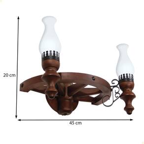 A arandela mede 45 cm de largura por 20 cm de altura, com 30 cm de afastamento da parede, o que garante um bom destaque visual sem ocupar muito espaço. Unidades por embalagem: 1 | Formato da luminária: Arandela | Lugares de montagem: Parede | Materiais: Madeira, Metal, Vidro | Alimentação: Elétrico | Potência: 9 W | Ambientes: Internos | Capacidade de lâmpadas: 2 | Tipos de fontes de luz: LED | Com wi-fi: Não | Aplicações inteligentes compatíveis: Não | Tipo de luminária de teto: Não | É pendente: Não | Comprimento: 0 | Altura: 20 cm | Tipo de soquete da lâmpada: E27 | Sem fio: Não | Autoadesiva: Não | Controle remoto: Não | Sistema de pressão: Não | Wi-Fi: Não | Assistentes virtuais compatíveis: Não | Principais Características do Produto: Madeira | Regulamentações de produtos perigosos: 0 | Fabricante: Mller | EmbalagemComprimento-cm: 42.5 | Peso Líquido: 0.0000 | Modelo: Roda de Carroça | Cubagem: 0.096103125 | Marca: Luminárias Muller | EmbalagemLargura-cm: 67.5 | Dias Fornecedor: 1 | EmbalagemAltura-cm: 33.5 Marca: Não Informado Ean: 7897139817653
