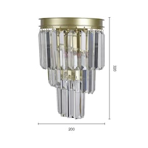 Especificações gerais do produtoDimensões AxLxP mm : 320x200x120Cor: DouradoMaterial: Metal e CristalGarantia: 1 ano junto ao fabricanteReferência: LA-002MVoltagem: BivoltLocal de Uso: InternoLâmpada Inclusa: NãoNúmero de Lâmpadas: 2Soquete: E14O que acompanha o produto1 Arandela
