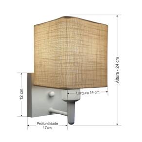 Arandela Quadrada Md-2006 Branco Cúpula Em Tecido Palha - Bivolt Arandela de parede Quadrada Md-2006 Branco Cúpula em Tecido Palha - BivoltAs arandelas Lustres Vivare são elementos versáteis e elegantes que podem transformar qualquer ambiente em um espaço cheio de estilo. Seja para adicionar uma iluminação suave, destacar uma parede ou criar um efeito de luz diferenciado.Dimensão:Cúpula em Tecido: 15x14x14cm Arandela de parede Montada: Altura 24cm Largura 14cm Profundidade 17cm Formato: Quadrado Tamanho: Pequeno Especificação:Material: Cúpula em Tecido Estrutura em Alumínio Base Parede: Quadrado 12x12x2cm Resistente: Á Maresia Voltagem: 110V/220V Liga e Desliga: Não Tipo de Soquete: E27 Lâmpada Utilizada: Led Bulbo Até 16w ou Fluorescente Espiral Até 25w Cada Capacidade de Lâmpadas: 1 Observação:Acompanha Lâmpada: Não Possui Led Integrado: Não Garantia: 12 Meses Manual de Instalação: Sim Arandela de parede Montada: Sim Controle de Luminosidade: Não Tipo de Embalagem: Caixa Conservação e Manutenção do Produto:A Limpeza deve ser realizada com o produto desligado. Remova o lustre que pode ser lavado com sabão neutro. Nunca utilize produtos químicos e abrasivos Dica:Antes de comprar o seu produto verifique as medidas, o local onde pretende instalar e se necessário o serviço de um profissional qualificado.