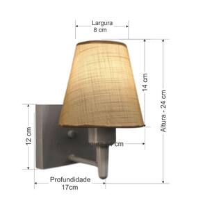 Arandela Quadrada Md-2034 Cinza Cúpula Em Tecido Cone Palha - Bivolt Arandela de parede Quadrada Md-2034 Cinza Cúpula em Tecido Cone Palha - BivoltAs arandelas Lustres Vivare são elementos versáteis e elegantes que podem transformar qualquer ambiente em um espaço cheio de estilo. Seja para adicionar uma iluminação suave, destacar uma parede ou criar um efeito de luz diferenciado.Dimensão: Cúpula em Tecido: 14x07x14cm Arandela de parede Montada: Altura 24cm Largura 14cm Profundidade 17cm Formato: Quadrado / Cone Tamanho: Pequeno Especificação: Material: Cúpula em Tecido Estrutura em Alumínio Base Parede: Quadrado 12x12x2cm Resistente: Á Maresia Voltagem: 110V/220V Liga e Desliga: Não Tipo de Soquete: E27 Lâmpada Utilizada: Led Bulbo Até 16w ou Fluorescente Espiral Até 25w cada Capacidade de Lâmpadas: 1 Observação: Acompanha Lâmpada: Não Possui Led Integrado: Não Garantia: 12 Meses Manual de Instalação: Sim Arandela de parede Montada: Sim Controle de Luminosidade: Não Tipo de Embalagem: Caixa Conservação e Manutenção do Produto: A Limpeza deve ser realizada com o produto desligado. Remova o lustre que pode ser lavado com sabão neutro. Nunca utilize produtos químicos e abrasivos Dica: Antes de comprar o seu produto verifique as medidas, o local onde pretende instalar e se necessário o serviço de um profissional qualificado.