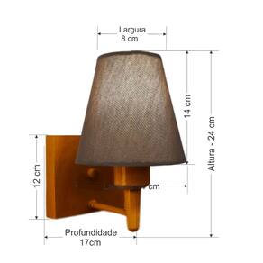 Arandela de parede Quadrada Md-2034 Cobre Cúpula em Tecido Cone Caqui - BivoltAs arandelas Lustres Vivare são elementos versáteis e elegantes que podem transformar qualquer ambiente em um espaço cheio de estilo. Seja para adicionar uma iluminação suave, destacar uma parede ou criar um efeito de luz diferenciado.Dimensão: Cúpula em Tecido: 14x07x14cm Arandela de parede Montada: Altura 24cm Largura 14cm Profundidade 17cm Formato: Quadrado / Cone Tamanho: Pequeno Especificação: Material: Cúpula em Tecido Estrutura em Alumínio Base Parede: Quadrado 12x12x2cm Resistente: Á Maresia Voltagem: 110V/220V Liga e Desliga: Não Tipo de Soquete: E27 Lâmpada Utilizada: Led Bulbo Até 16w ou Fluorescente Espiral Até 25w cada Capacidade de Lâmpadas: 1 Observação: Acompanha Lâmpada: Não Possui Led Integrado: Não Garantia: 12 Meses Manual de Instalação: Sim Arandela de parede Montada: Sim Controle de Luminosidade: Não Tipo de Embalagem: Caixa Conservação e Manutenção do Produto: A Limpeza deve ser realizada com o produto desligado. Remova o lustre que pode ser lavado com sabão neutro. Nunca utilize produtos químicos e abrasivos Dica: Antes de comprar o seu produto verifique as medidas, o local onde pretende instalar e se necessário o serviço de um profissional qualificado.